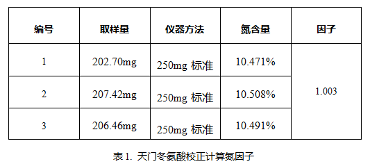 待TCD检测器温度升至59℃左右开始进行测定。首先加氧空烧两三次,排除燃烧管内残留O2。开始测试,选择250mg标准,天门冬氨酸校正计算氮因子,而后得到奶粉样品中蛋白质含量。