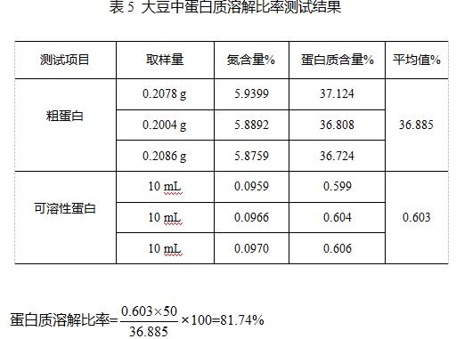 测试结果显示本次测试的大豆的蛋白质溶解比率为81.74%,大于《GB/T 31785-2015 大豆储存品质判定规则》中规定的75%,属宜存大豆。
