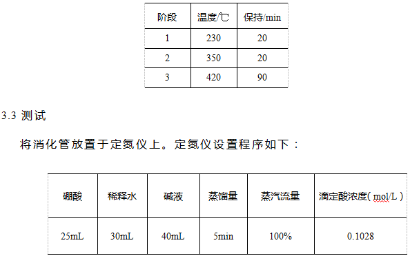 硫酸(分析纯),20g/L硼酸溶液,溴甲酚绿-甲基红混合指示剂,40%氢氧化钠,混合催化剂压片(3gK2SO4、0.2gCuSO4),0.1mol/L硫酸标准滴定液。