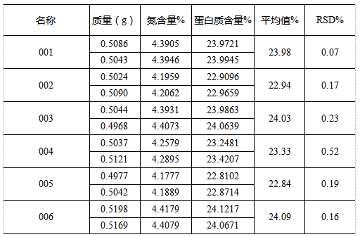 以上实验数据显示,使用K1100F凯氏定氮仪测定花生仁中的粗蛋白质所得结果符合《GB 5009.5-2016 食品安全国家标准 食品中蛋白质含量检测》标准要求两个测定值的绝对差值不得超过算术平均值的10%。