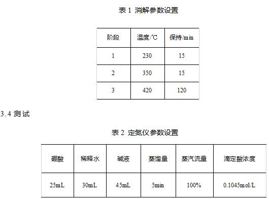 硫酸(分析纯),20g/L硼酸溶液,溴甲酚绿-甲基红混合指示剂,40%氢氧化钠,混合催化剂片(3gK2SO4、0.2gCuSO4),0.1mol/L硫酸标准滴定液。