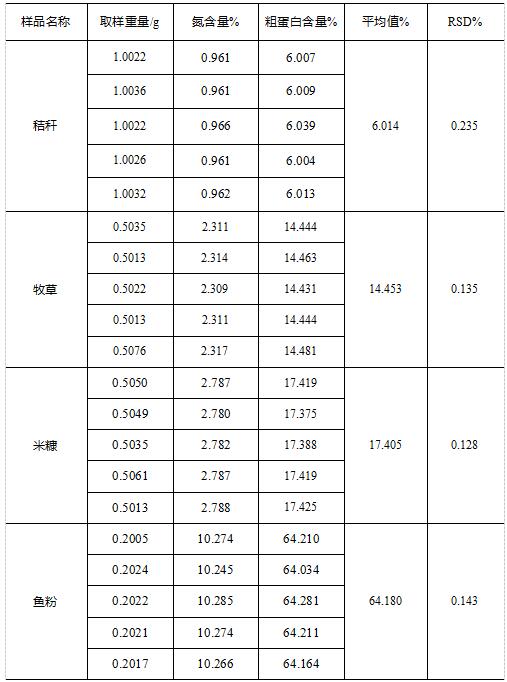 样品数据重复性符合国标《GB/T 6432-2018 饲料中粗蛋白的测定 凯氏定氮法》中的测试精密度的要求,且RSD均小于0.5%,重复性良好。