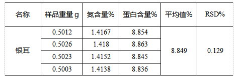 实验数据显示,使用K1100F凯氏定氮仪测定银耳中的蛋白质含量符合《NY/T834-2004 银耳》中粗蛋白≧6%的要求,所得结果误差均在《GB/T 15673-2009 食用菌种粗蛋白含量的测定》标准要求两个测定值的绝对差值不得超过算术平均值的10%。