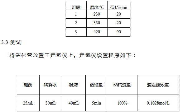 硫酸(分析纯),20g/L硼酸溶液,溴甲酚绿-甲基红混合指示剂,40%氢氧化钠,混合催化剂压片(3gK2SO4、0.2gCuSO4),0.1mol/L硫酸标准滴定液。