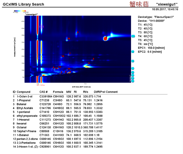 使用G.A.S.公司FlavourSpec®风味分析仪,在无需样品前处理前提下,经孵化顶空进样后可快速检测食用菌挥发性有机物,仪器配备的强大功能软件可给出样品的气相离子迁移谱图及挥发性有机物的指纹谱图,通过挥发性有机物的气相离子迁移谱图,我们可以: