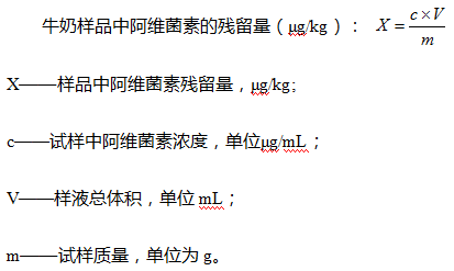取试样及不添加样品的空白溶液,按外标法,以峰面积计算,根据回归方程,得出试样中阿维菌素含量。