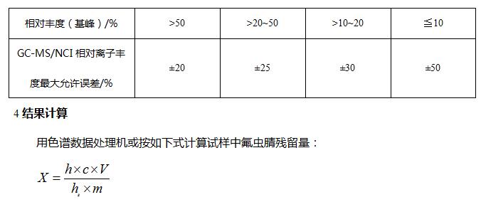 如果样液与标准工作溶液的选择离子色谱图中,在相同保留时间有色谱峰出现,并且在扣除背景后的样品质谱图中,所选离子均出现,所选择离子的丰度比与标准对应离子的丰度比,其值在允许范围内(允许范围见表1)。在测试条件下,氟虫腈保留时间是11.1min,其监测离子(m/z)为m/z366、333、368、400(其丰度比为100:27:70:35)对其进行确证;根据定量离子m/z366对其进行外标法定量。