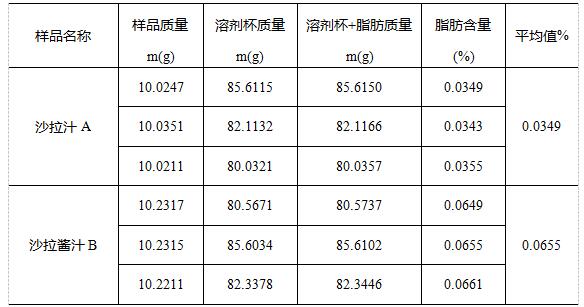 从以上数据可以看出两种不同品牌沙拉(酱)汁中抽提出的粗脂肪含量很低。沙拉(酱)汁里面添加了一些植物配料如胡萝卜、葱花等,索氏抽提过程中也会将这类配料中的植物色素、蜡质抽提出来。由此可判定,该两种品牌沙拉(酱)汁符合其营养参考值中标注的0脂肪是可信的。