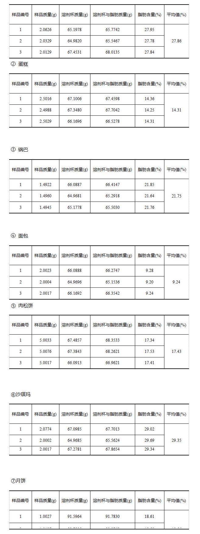 由实验结果可知,糕点类食品脂肪含量较高,萃取时间根据样品质量和脂肪含量增多相应加长;当该种类样品量为1.5-5g时,建议萃取时间设置大于3h,以便取得更好的测试结果。