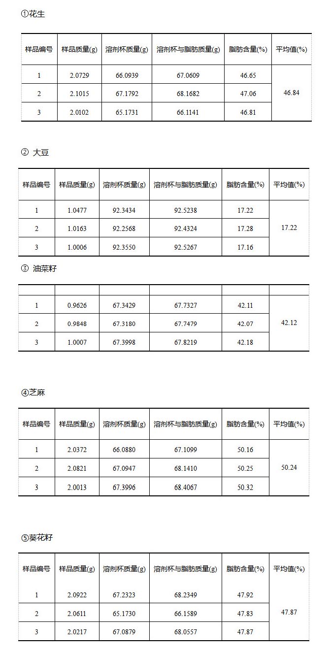 油料作物是以榨取油脂为主要用途的一类作物。常见的油料作物有花生、大豆、芝麻、油菜、向日葵等。由其榨取的植物油是人体必需脂肪酸摄入的重要来源,也是多种工业产品的原材料。其中脂肪含量测定原理为:将试样用有机溶剂回流提取,使试样中的脂肪被溶剂抽提出来,回收溶剂后所得到的残留物,即粗脂肪。