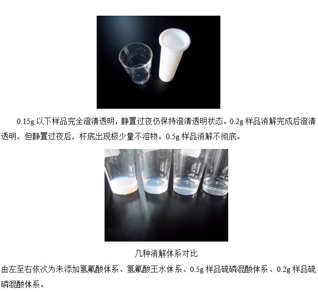 以上仍呈现乳浊状态。而添加氢氟酸的消解体系,样品静置半小时后出现沉淀现象。所以,判定样品中二氧化硅或者硅酸盐的含量比较高。