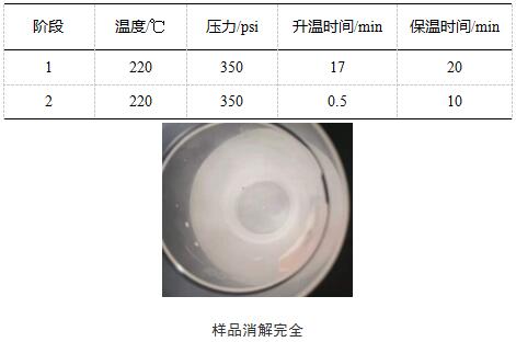 二氧化锆样品化学性质不活泼,不易溶解,采用盐酸+硫酸+氟硼酸的酸体系在220度下保温30分钟,可将0.1g的样品消解至澄清透明状态。