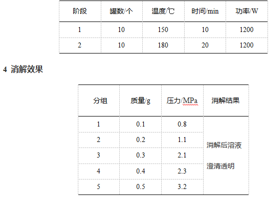 通过上表可以看出取样量在0.5g的时候,消解压力超过了3MPa,为确保实验的安全性,建议取样量不高于0.4g。