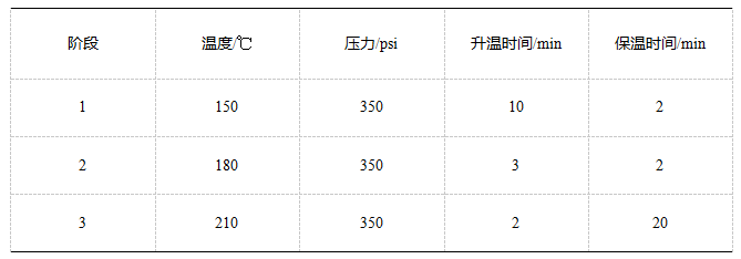 称取5组样品质量为0.5g(精确至0.1mg),另外添加一组空白,分别加入8mL浓硝酸、2mL过氧化氢和1mL氢氟酸,室温静置一段时间,待其反应完全后,则组装消解罐,按照如下设置参数进行消解: