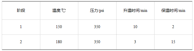 称取5组样品质量为0.5g(精确至0.1mg),另外添加一组空白,分别加入6mL浓硝酸和2mL过氧化氢,室温静置一段时间,待其反应完全后,则组装消解罐,按照如下设置参数进行消解: