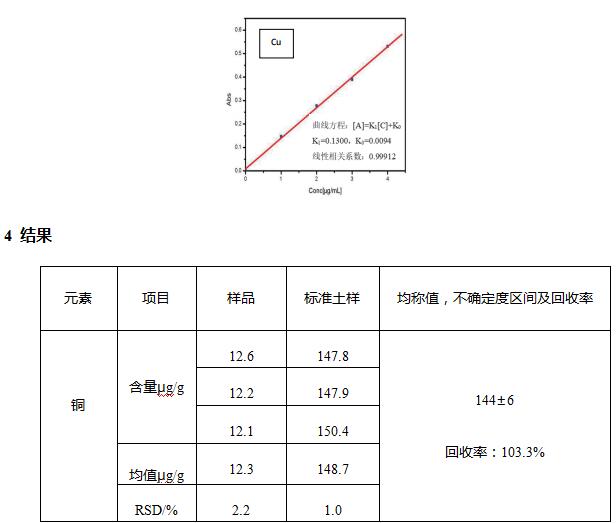 土壤样品中铜含量为12.3ppm,测量结果的RSD=2.2%,表明重复性较好。标准品回收率为103.3%,证明此用此方法处理土壤样品,元素损失较少。