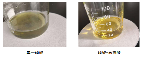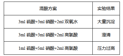 硫酸具有极强的脱水碳化能力,同时沸点较高,可以防止消解压力过高。高氯酸氧化性极强,可将碳氧化为二氧化碳。消解样品最佳温度210℃,取样量不高于0.1g。