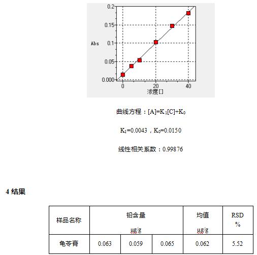 龟苓膏样品中铅含量为0.062μg/g,测量结果的RSD=5.52%,平行性良好。