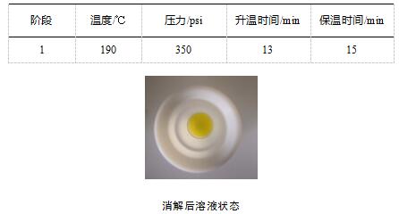 预消解结束后,将消解罐取下冷却至室温,补加2mL过氧化氢,静置10min左右,观察反应状况,如无明显反应,组装消解罐,按照以下参数微波消解:
