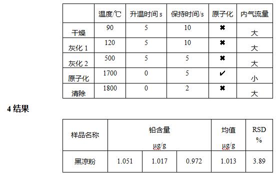 黑凉粉样品中铅含量为1.013μg/g,测量结果的RSD=3.89%,表明重复性较好。