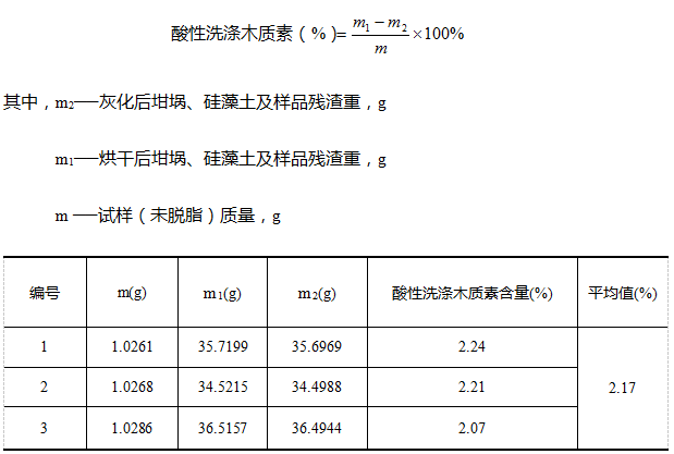 根据Van Soest方法结合海能F800纤维测定仪测定饲用燕麦中酸性洗涤木质素的含量原理如下:样品经酸性洗涤剂的消煮后,得到残渣成分为纤维素、木质素和硅酸盐,再经12mol/L硫酸常温下消解,洗去纤维素得到残渣成分为木质素和硅酸盐;再将样品经高温灰化,通过得硅酸盐重量,通过差重法得出酸性洗涤木质素含量。