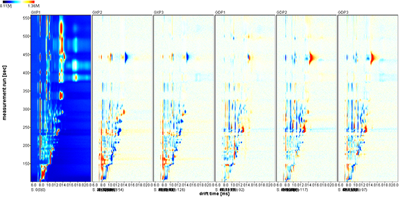 3) RIP峰两侧的每一个点代表一种挥发性有机物。颜色代表物质的浓度,白色表示浓度较低,红色表示浓度较高,颜色越深表示浓度越大