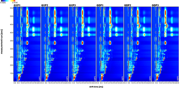 1) 纵坐标代表气相色谱的保留时间,横坐标代表离子迁移时间