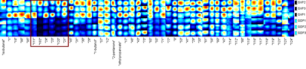 由于上图太小,因此选取可以区分两个产地柚子的特异性挥发性有机物放大显示,如下图所示: