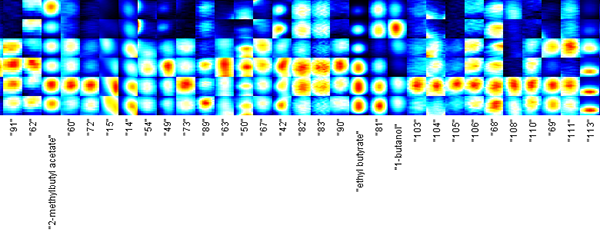 2) 图中每一列代表同一挥发性有机物在不同柚子皮样品中的信号峰