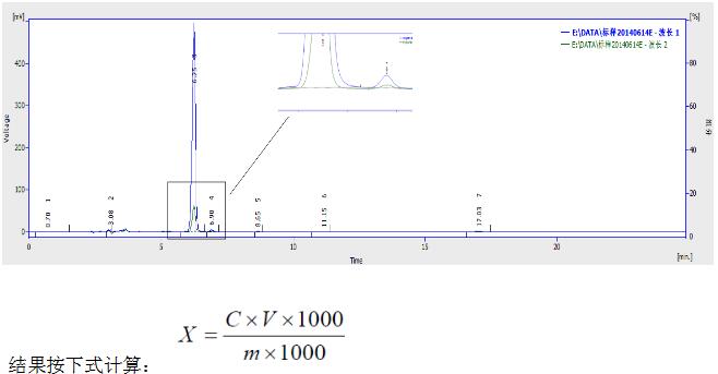 称取5.0 g 试料,于10 mL 烧杯中,精确至0.01 g,加流动相适量,混匀后,移入50mL 容量瓶中,加流动相定容至刻度。充分振荡混匀后,过0.22 μm 有机滤膜待测。