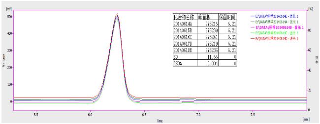图中可见,甜菊糖苷连续5针进样,峰面积重复性RSD%0.004,保留时间重复性良好,完全满足方法要求。