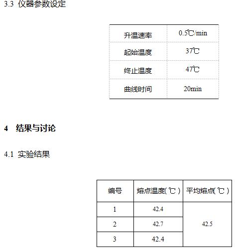 调节仪器温度,设置合适的测试参数,待温度达到设定温度后,从冰箱中取出毛细管样品进行测试,放到仪器加热炉中开始测试,观察并记录每个毛细管油面浮升的温度,计算其平均值,即为试样的熔点。