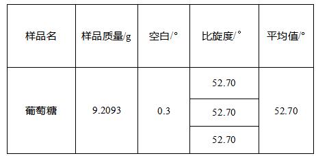 称取一定量的葡萄糖于烘箱中烘干至恒重后称取约10g左右于100mL容量瓶中,加入氨水0.2mL,混匀后静置10min。后用P810旋光仪在25℃下测定其比旋度。取另一100mL容量瓶加入氨水0.2mL后定容,做其空白试验。