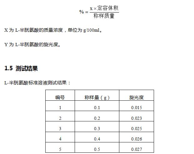 由于L-半胱氨酸有不对称碳原子,当偏振光通过时发生偏振面的旋转,因此具有旋光性。而偏振面的旋转角度与溶液的浓度成正比。所以我们利用这一性质配制一系列的标准浓度的L-半胱氨酸溶液来测定其旋光度。这样就可以得出一条旋光度对浓度的标准工作曲线,按照以浓度为横坐标,旋光度为纵坐标做标准曲线,将测出的旋光度代入公式测出浓度,浓度乘以定容体积/称样质量,从而计算出含量。