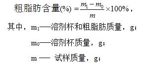 2.取样:精确称取样品约2.5g左右(记为m),放入研钵中将其研碎,并用脱脂棉将研钵上残留脂肪用乙醇擦拭干净,一并放入滤纸筒内,并覆盖上一层脱脂棉,放入80℃烘箱烘干1h。