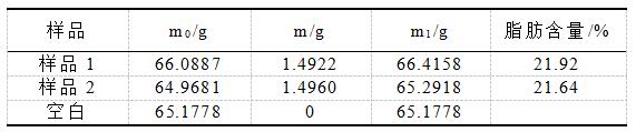 由表格中数据可知,所做的空白样品在实验前与实验后质量未增加,即空白中不含脂肪。