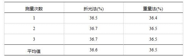 重量法操作繁琐,耗时长,测试一个样品一般需要半天以上的时间,成本较高;而折光法操作简单,一般测定一个样品仅需20~30 s,适合批量样品的快速分析检测,且准确度高,操作简单,便于现场采样测试。
