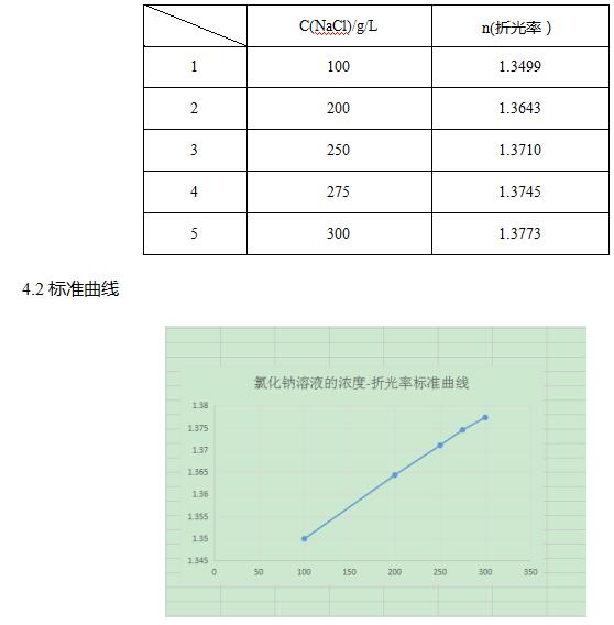 测定方法:称取10g、20g、25g、27.5g、30g氯化钠分别溶液100ml容量瓶中,配制成浓度为100g/L、200g/L、250g/L、275g/L、300g/L的标准溶液,摇匀后备用。待折光仪温度稳定在设定温度后用蒸馏水校准机器。分别测定标准溶液的折光率,并绘制标准曲线。