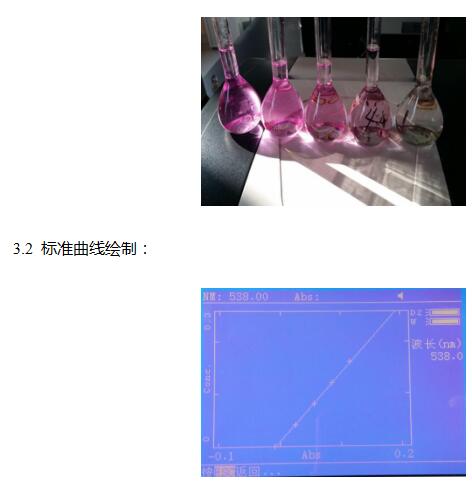 3.1.2样品测定:吸取50.0mL上述滤液于容量瓶中,另吸取0.00mL、0.40mL、0.80mL、1.20mL、1.60mL亚硝酸钠标准使用液,分别置于50mL容量瓶中。于标准管与试样管中分别加入2mL4g/L对氨基苯磺酸溶液,混匀,静置3min~5min后加入1mL2g/L盐酸奈乙二胺溶液,加水至刻度,混匀,静置15min,用1cm比色杯,以零管调节零点,于波长538nm处测吸光度,绘制标准曲线比较。同时做试剂空白。