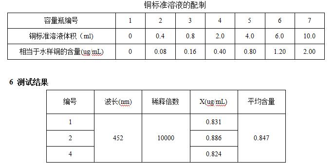 由以上实验可得结论,此水溶液原液中铜离子浓度为8470ug/mL。当水中铜离子浓度在0.06~2.5ug/mL范围内用此法进行测定时,可获得较好的准确度和精密度,而且避免了大量使用有机试剂萃取所带来的污染和浪费,是测定被铜污染的水质的有效方法。