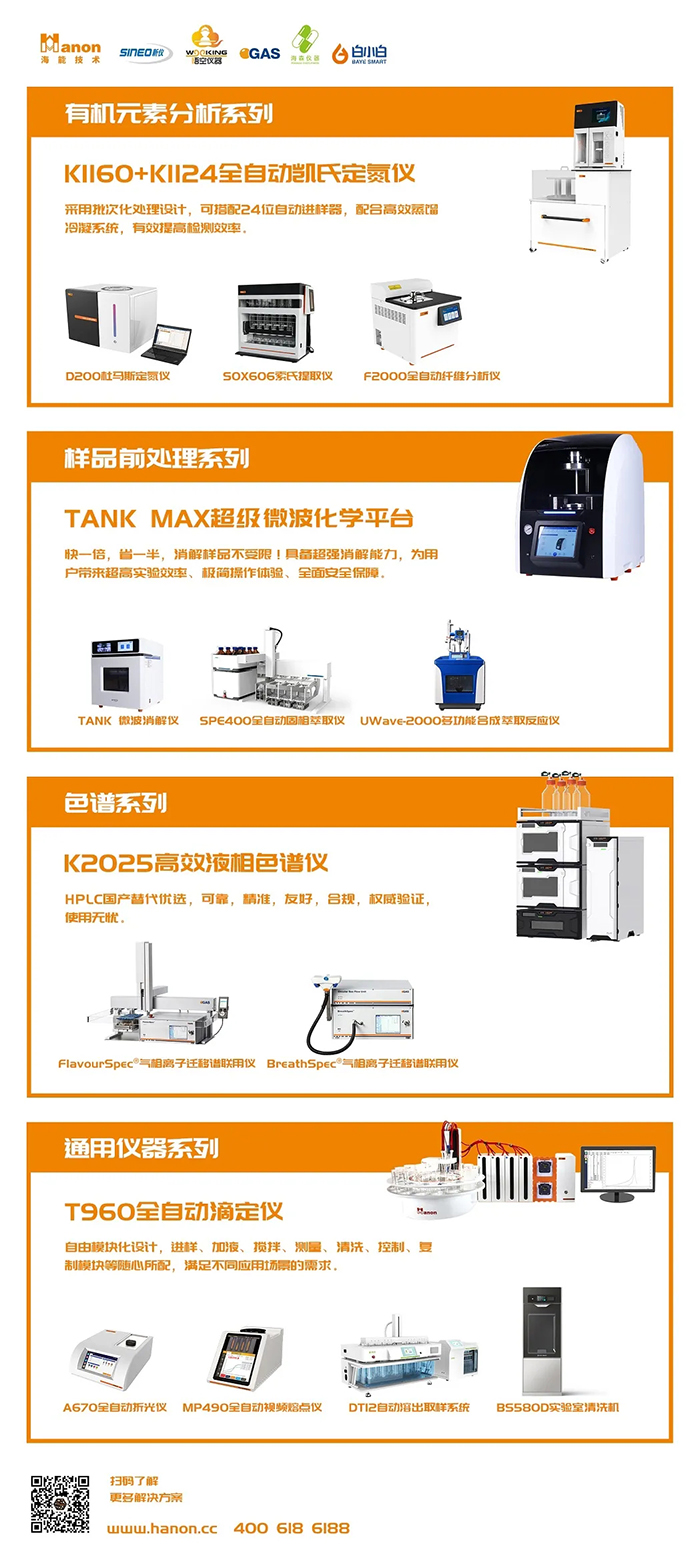 海能技术拥有海能、新仪、悟空、G.A.S.、海森、白小白6个品牌,逐步形成了以有机元素分析、样品前处理、色谱光谱、通用仪器为主的四大系列百余款产品,广泛应用于食品、医药、农林水产、环境、第三方检测、化工、新能源、半导体、新材料、科研与教育等领域,为广大科研工作者和质量控制从业人员提供生产工具和分析检测方法。