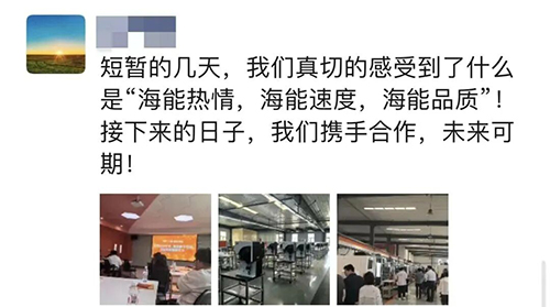 “短暂几天,我们真切地感受到了什么是‘海能热情,海能速度,海能品质’,接下来的日子,我们携手合作,未来可期!”活动结束,渠道商伙伴表达内心感受,让海能备受鼓舞,且荣幸为伙伴们带来了妥帖体验。后续陆续还将有山西等地伙伴到访,海能将继续为大家提供贴心、专业的服务。