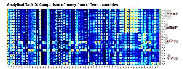| 图3给出了不同地区蜂蜜的指纹图对比,从图中可以看出,台湾的龙眼蜂蜜具有其独特的指纹峰(红框区域),可以依此来鉴定蜂蜜的产地。 |