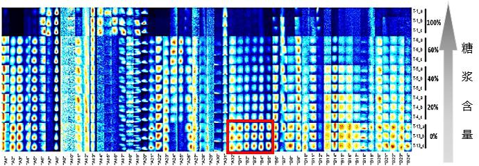 向蜂蜜中掺入不同含量的糖浆,其指纹图如图4所示。随着糖浆含量的不断增加,蜂蜜的特征峰(红框圈出)强度在逐渐减小。因此可以鉴别蜂蜜中是否添加糖浆。