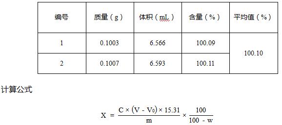 氟康唑原料药含量大于99.0%即为合格,本次实验样品氟康唑原料药中含量为100.10%,符合要求。另外,实验结果表明,本次实验重复性良好,可以满足检测需求。