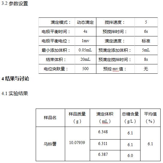 根据标准要求,用电位滴定法测定马铃薯中还原糖含量,两次测定结果的绝对差值小于其算术平均值的5%,实验结果重复性较好。