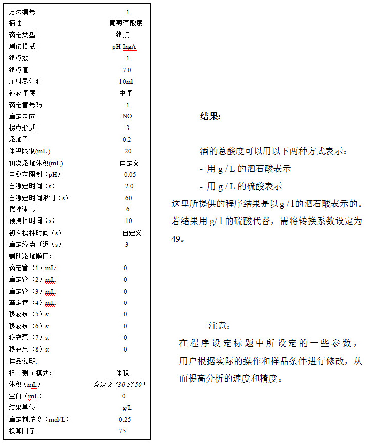 酒的总酸度是可滴定酸度的总和,使用标准浓度的NaOH溶液滴定pH至7.0,结果用 g / l的酒石酸(或硫酸)表示。由于CO2会影响实验的测定,样本测试前必须先前在超声浴中或搅拌下真空脱气。