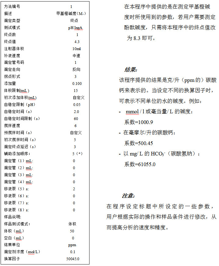 - 取典型的地表水和饮用水,样品体积为50ml时的碱度值为最优测定值,但可根据具体的样品条件及取样量进行具体的优化。