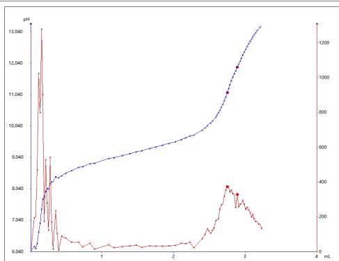 由酸价图谱可知,不同的方便面油脂图形走势不同,所以需要根据国标中提供的参考图仔细分辨,实验结果平行良好,可以使用自动进样器进行滴定。另外,酸价图谱前端均出现高突跃量的杂峰,所以应设置相应的预控pH值,以免影响最终结果的判定。