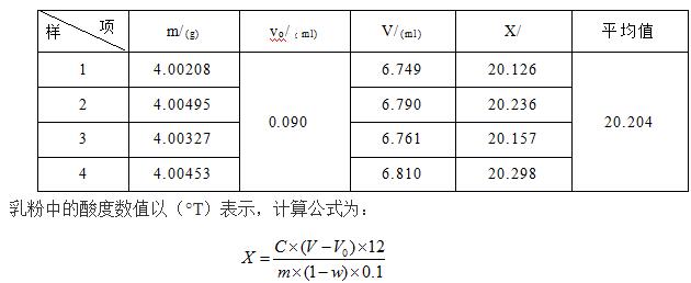 此奶粉中酸度平均值为20.204°T,采用此法简单快捷,结果平行性良好。